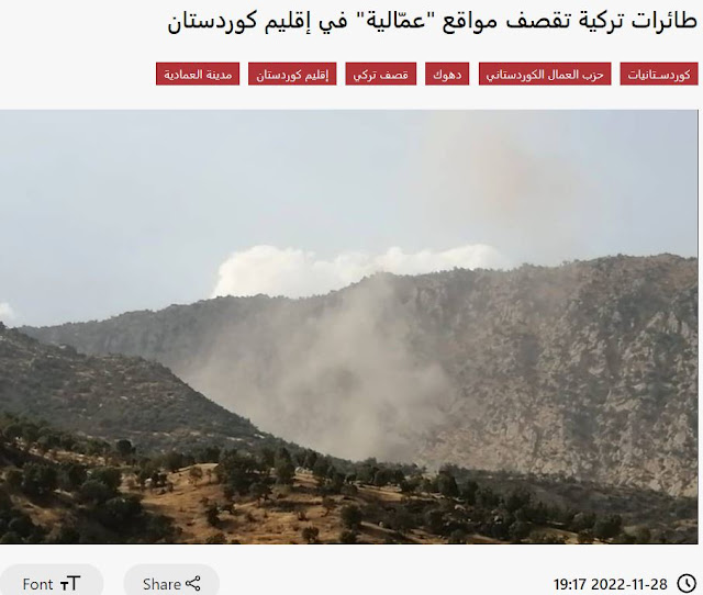 Τη Δευτέρα, τουρκικά πολεμικά αεροσκάφη βομβάρδισαν περιοχές στην περιοχή Αμαντίγια του κυβερνείου Ντοχούκ στην περιοχή της Περιφέρειας του Κουρδιστάν στο βόρειο Ιράκ.