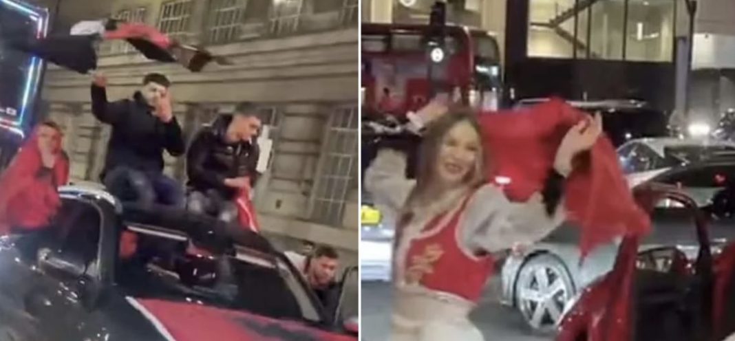 Βίντεο που έχουν δημοσιευτεί στα μέσα κοινωνικής δικτύωσης δείχνουν Αλβανούς να πανηγυρίζουν κρατώντας αλβανικές σημαίες, με πολλούς χρήστες ωστόσο να εστιάζουν στα… πολυτελή οχήματα, όπως Lamborghini και Mercedes.