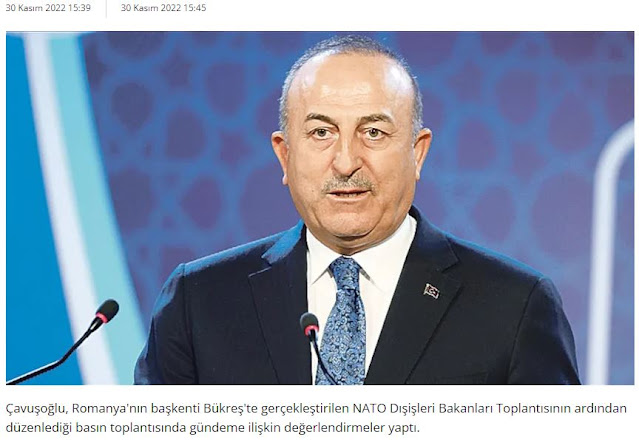 Ο υπουργός Εξωτερικών της Τουρκίας, Μεβλούτ Τσαβούσογλου, έκανε αξιολογήσεις στα τρέχοντα θέματα, στη συνέντευξη Τύπου που παραχώρησε μετά τη Σύνοδο των Υπουργών Εξωτερικών του ΝΑΤΟ που πραγματοποιήθηκε στο Βουκουρέστι, την πρωτεύουσα της Ρουμανίας.