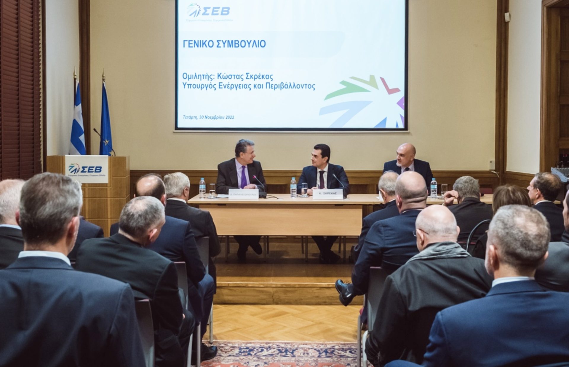 Απευθυνόμενος στα μέλη του Γενικού Συμβουλίου ο κ. Σκρέκας παρουσίασε αναλυτικά τα μέτρα στήριξης της Κυβέρνησης για τους εμπορικούς και βιομηχανικούς καταναλωτές ηλεκτρικού ρεύματος και φυσικού αερίου, από την έναρξη της διεθνούς ενεργειακής κρίσης. Στον τομέα του πράσινου μετασχηματισμού της οικονομίας, ο Υπουργός Περιβάλλοντος και Ενέργειας υπογράμμισε την ψήφιση σημαντικών διατάξεων για την προώθηση του net metering και την αύξηση του ηλεκτρικού χώρου για τη μείωση του κόστους στη βιομηχανία, με την προώθηση της αυτοπαραγωγής και του ενεργειακού συμψηφισμού.