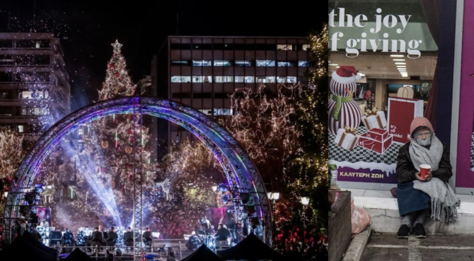 Όμως λίγα μέτρα πιο κάτω από τα φανταχτερά φώτα, υπάρχει η εικόνα της άλλης Αθήνας, που αντικατοπτρίζει την κατάσταση που βιώνουν συμπολίτες μας. Μια άστεγη ηλικιωμένη έχει στολίσει χριστουγεννιάτικα το πεζοδρόμιο που έχει βρει καταφύγιο, για να δώσει μια γιορτινή νότα, ελπίζοντας σε ένα θαύμα…