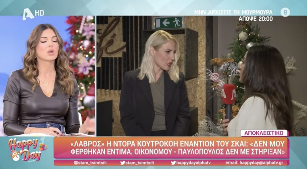 «Η σχέση μου με τους παρουσιαστές εδώ και πάρα πολλά χρόνια είναι άριστη. Ξαφνιάστηκα που δεν με στήριξαν ο Δημήτρης Οικονόμου και ο Άκης Παυλόπουλος. Όταν έχεις διαγράψει μια τέτοια πορεία στη δημοσιογραφία και την παρουσίαση όπως ο Δημήτρης και ο Άκης, θεωρώ ότι αυτό δεν τιμά ούτε εκείνους. Το απόγευμα της Πέμπτης μου ανακοινώθηκε ότι δεν θα είμαι στην εκπομπή σήμερα. Δεν θεωρώ ότι έκανα κάτι λάθος, η στάση δεν ήταν έντιμη απέναντί μου. Θα αποχαιρετήσω τους φίλους της εκπομπής μέσω του Happy Day, γιατί μέσω του ΣΚΑΪ δεν θα τα καταφέρω. Δεν θα αποδεχτώ άλλη πρόταση από τον ΣΚΑΪ» τόνισε η Ντόρα Κουτροκόη. Πρωτοσελιδα – Ειδήσεις