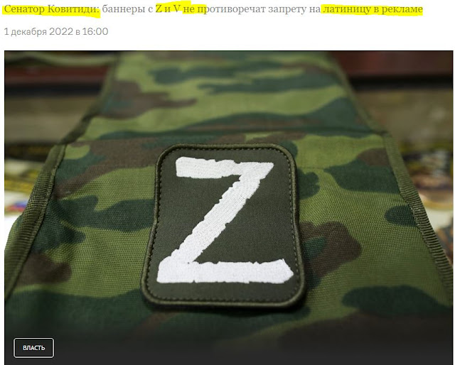 Ωστόσο, τα σύμβολα  της ειδικής στρατιωτικής επιχείρησης στην Ουκρανία,  που αναγράφονται στα στρατιωτικά οχήματα, όπως το  Z και το V δεν έρχονται σε αντίθεση με το νομοσχέδιο που απαγορεύει τη χρήση του λατινικού αλφαβήτου στη διαφήμιση, είπε η γερουσιαστής Όλγα Κοβιτίδη, συν-συγγραφέας της πρωτοβουλίας, μέλος της Επιτροπής Νομοθεσίας και Κρατικής οικοδόμησης του Συμβουλίου της Ομοσπονδίας, σύμφωνα με την  Lenta.ru.