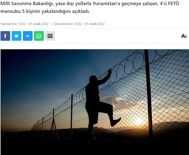 Όπως σημειώνεται : «Οι Αετοί των συνόρων μας συνέλαβαν 5 άτομα που προσπαθούσαν να περάσουν παράνομα από τη χώρα μας στην Ελλάδα. Στην έρευνα διαπιστώθηκε ότι 4 από τους συλληφθέντες ήταν μέλη της τρομοκρατικής οργάνωσης FETÖ.