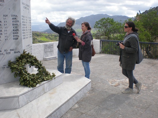 Γερμανίδες δημοσιογράφοι ενημερώνονται στο μνημείο από κάτοικο της Καλής Συκιάς για την πυρπόληση των γυναικών