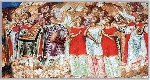 Την ίδια λοιπόν εποχή, που επαγγελματίες συνήθως χορευτές συμμετέχουν σε κοσμικές εκδηλώσεις δημόσιου ή ιδιωτικού χαρακτήρα (θέατρο, συμπόσια, χοροδράματα, παντομίμες κ.ά.), από το νάρθηκα των βυζαντινών ναών ακούγονται μοιρολόγια που συνοδεύονται από έντονες χορευτικές κινήσεις, ενώ οι νεόνυμφοι βηματίζουν αργά γύρω από την Αγία Τράπεζα με τη συνοδεία του τροπαρίου «Ησαΐα χόρευε…». Τα μουσικά όργανα που χρησιμοποιούσαν οι Βυζαντινοί: αυλούς, κιθάρες, πολύχορδα, κρουστά, κρουστά ή το «πολύαυλον όργανον» «το εκκλησιαστικό» οργανο, όπως είναι γνωστό σήμερα.
