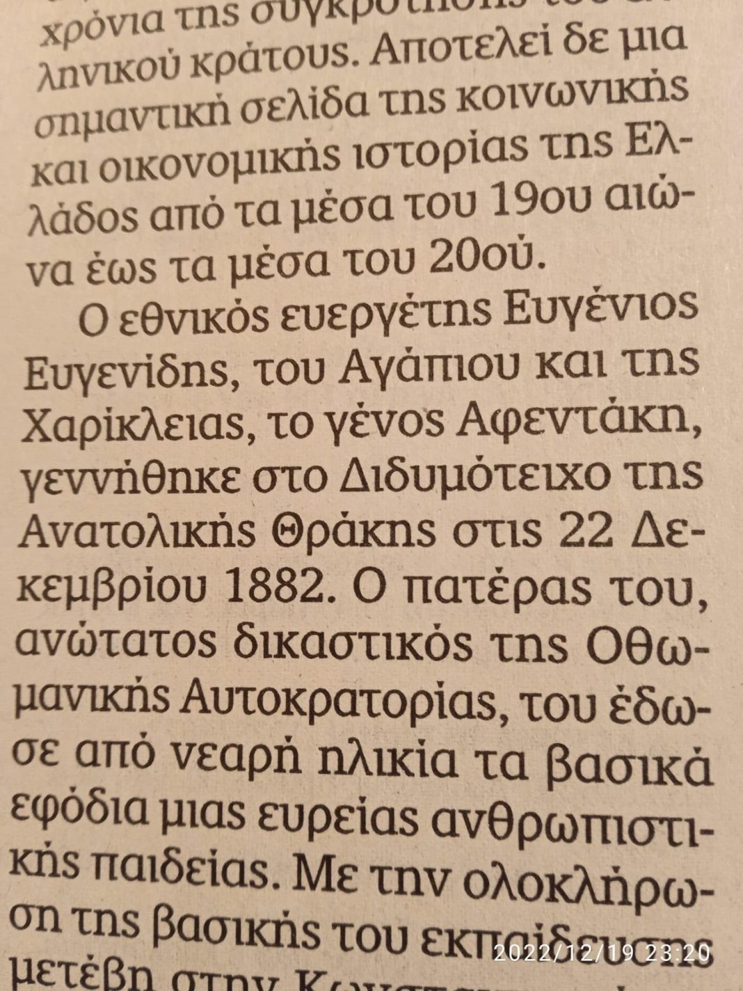 Στη σημερινή «Καθημερινή» (18/12/2022) δημοσιεύεται ένα ενδιαφέρον κείμενο για τη ζωή και το έργο του μεγάλου επιχειρηματία και εθνικού ευεργέτη Ευγένιου Ευγενίδη. Όλοι γνωρίζουμε το Ευγενίδειο Πλανητάριο και την προσφορά του στην τεχνική εκπαίδευση της χώρας μας.