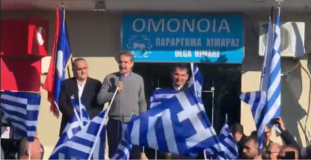 Γι’ αυτό και ο πρωθυπουργός Μητσοτάκης δεν μπόρεσε να συγκρατήσει την ελληνική εθνικιστική ευφορία στην ομιλία που έκανε μπροστά στην «Ομόνοια» σήμερα στη Χιμάρα: «Είναι μια ξεχωριστή στιγμή για μένα και για τον απανταχού Ελληνισμό. Αισθάνομαι τιμή που είμαι ο πρώτος Έλληνας πρωθυπουργός που επισκέπτεται τη Χιμάρα. Σας ευχαριστώ που κρατάτε τη φλόγα του Ελληνισμού και της Ορθοδοξίας».