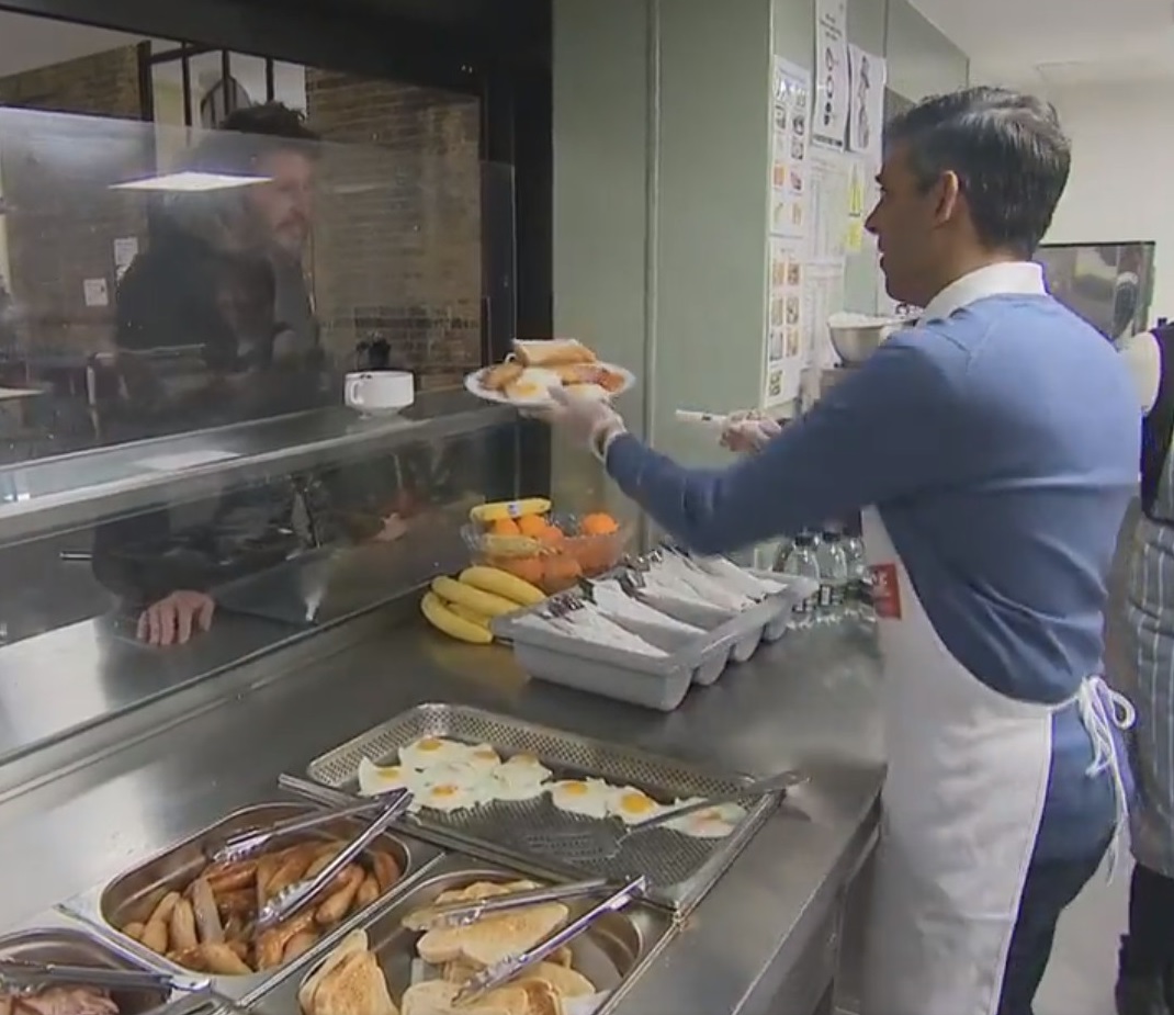 Ο Σούνακ, πρώην στέλεχος της τράπεζας Goldman Sachs και ένας από τους πλουσιότερους ανθρώπους στη Βρετανία, σερβίριζε πρωινό σε ένα καταφύγιο αστέγων στο Λονδίνο, την Παρασκευή, όταν έπιασε κουβέντα με έναν άνδρα που είπε ότι ονομάζεται Ντιν.