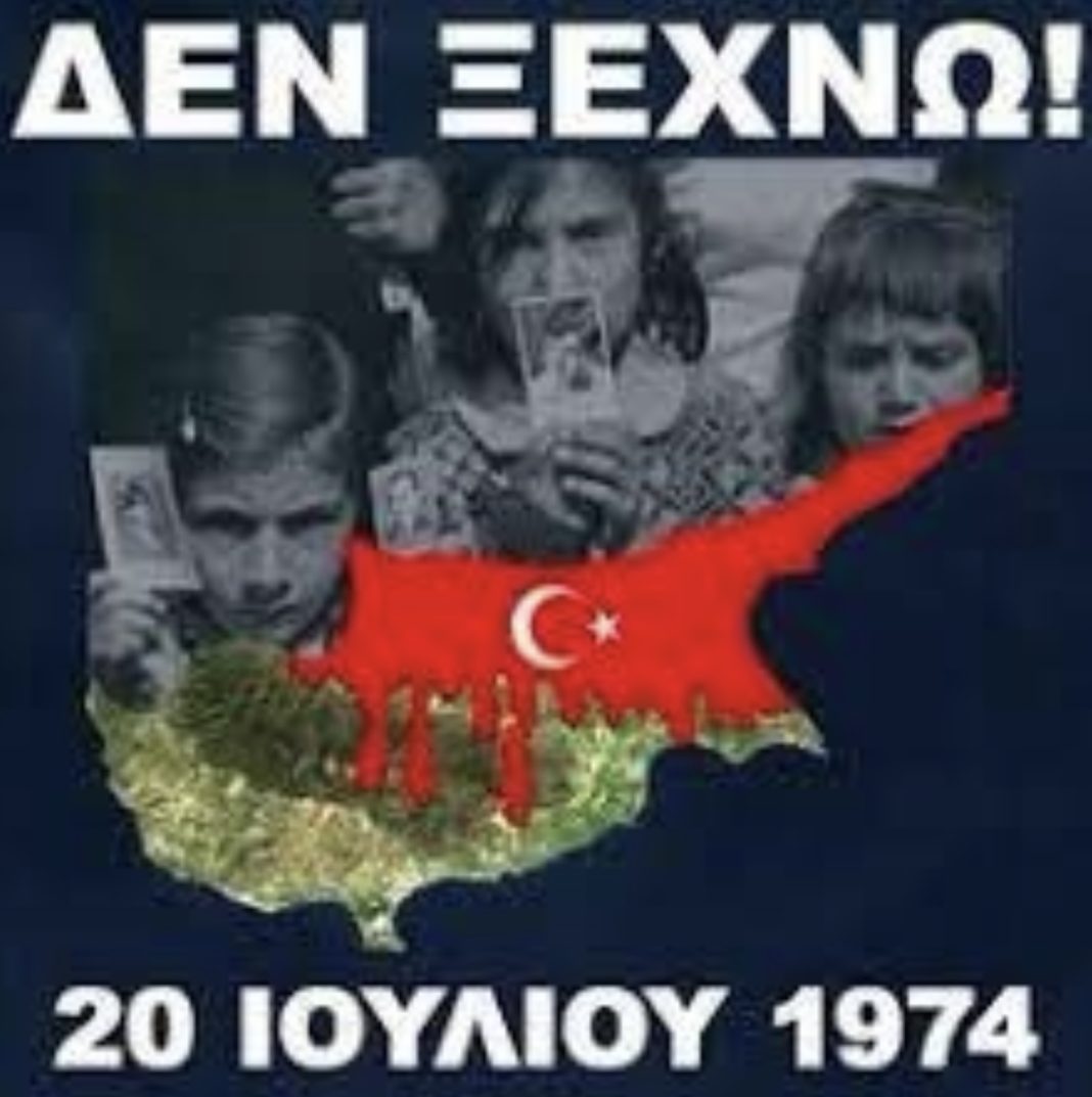 Τουρκική εισβολή στην Ελληνική Κύπρο 1974.                                                               Άνω των 250000 γηγενών Ελλήνω της Κύπρου εκτοπισμένοι, 6000 άμαχοι δολοφονημένοι, 1619 αγνοούμενοι, 850 όμηροι γυναίκες βάναυσα κακοποιημένες, 550 εκκλησίες λεηλατημένες. Το 38% των Κυπριακών εδαφών υπό κατοχή. Τίποτα ιερό και όσιο δεν άφησαν όρθιο. Τ Ι Π Ο Τ Α!