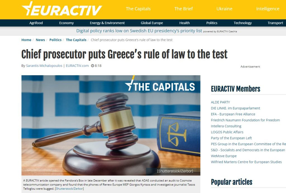 Αυξάνονται οι αναφορές των διεθνών ΜΜΕ για την αντισυνταγματική γνωμοδότηση Ντογιάκου για τον ρόλο της ΑΔΑΕ στην υπόθεση των παρακολουθήσεων. Μετά το Politico, ήταν η σειρά του Euractiv να καταγράψει τις σοβαρές αντιδράσεις που προκάλεσε ο Εισαγγελέας του Αρείου Πάγου, ο οποίος σαμποτάρει ευθέως τη διαδικασία ερευνών για το σκάνδαλο των παρακολουθήσεων.