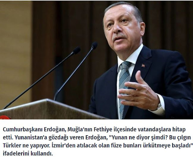 Ο Πρόεδρος Ερντογάν μίλησε στους πολίτες στην περιοχή Φετιγιέ της Μούγλα. Απείλησε ξανά την Ελλάδα, λέγοντας: «Τι λέει τώρα ο Έλληνας; Τι κάνουν αυτοί οι τρελοί Τούρκοι. Ο πύραυλος που θα εκτοξευθεί από τη Σμύρνη έχει αρχίσει να τους τρομάζει».