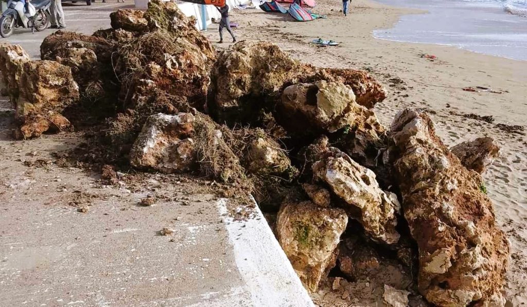 Τα βράχια (που δεν είναι δυνατόν να μεταφέρθηκαν στην παραλία…δια χειρός), τοποθετήθηκαν στο τσιμεντένιο πεζοδρόμιο αλλά και στην άμμο της παραλίας, ενέργεια αδιανόητη και παράνομη…