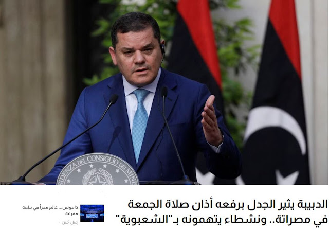 Ο απερχόμενος επικεφαλής της κυβέρνησης εθνικής ενότητας, Αμπντέλ Χαμίντ αλ Ντμπέιμπε, ακολουθώντας τη γραμμή του Τούρκου προέδρου με το Ισλάμ, προέβη σε κάλεσμα για προσευχή της Παρασκευής σε τζαμί στην πόλη Μισράτα, πυροδοτώντας διαμάχες και χλευασμούς, ενώ οι Λίβυοι ακτιβιστές τον κατηγόρησαν ότι ασκεί λαϊκισμό και θρησκευτική προπαγάνδα για πολιτικούς σκοπούς, γράφουν τα τοπικά μέσα ενημέρωσης.