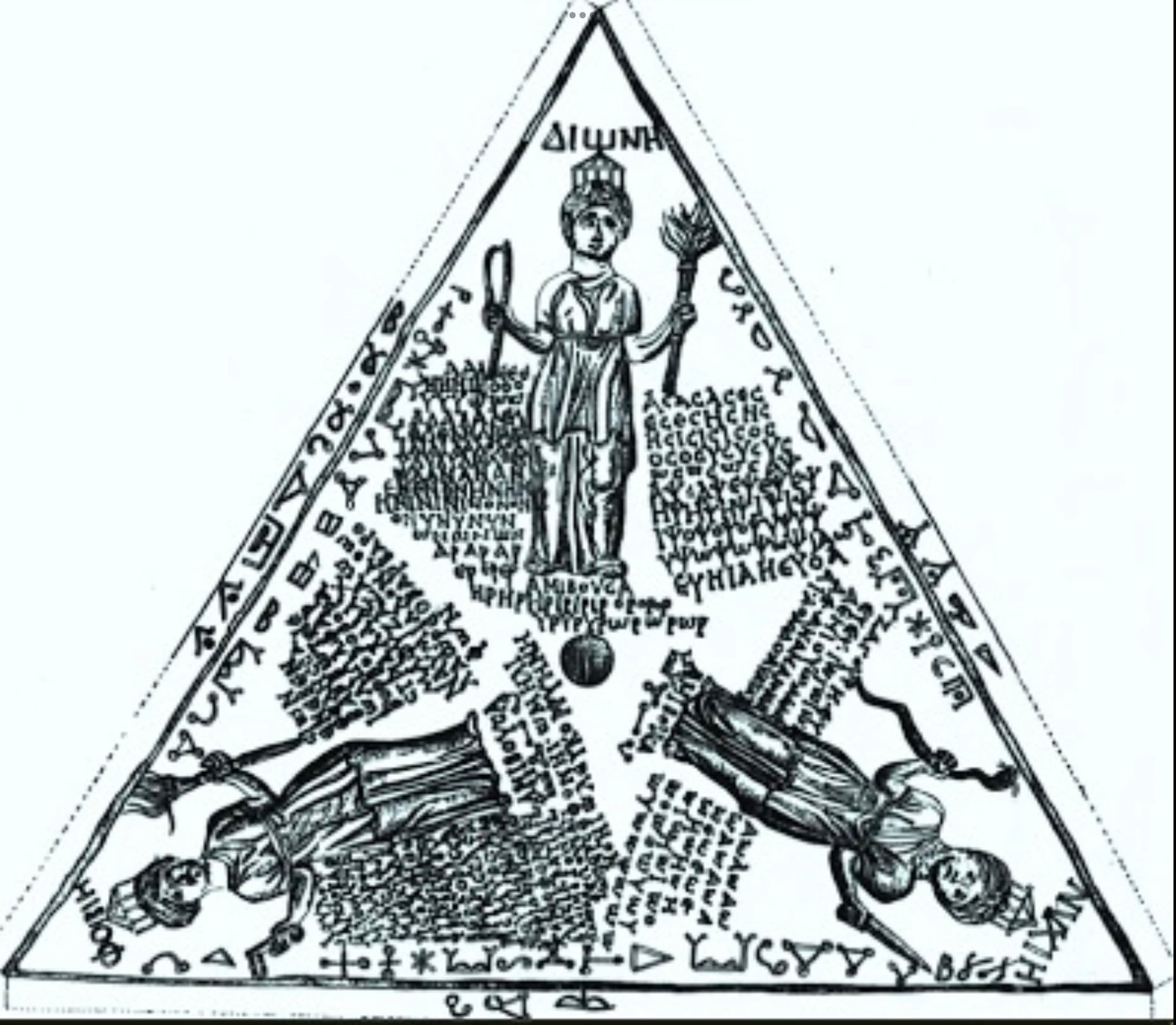 (*Φωτό:Σχέδιο από χάλκινο δισκίο που βρέθηκε στην Πέργαμο. Απεικονίζει τρεις στεφθείσες θεές με τα ονόματα ΔΙΩΝΗ, ΦΟΙΒΙΗ και ΝΥΧΙΗ. Η καθεμιά περιβάλλεται από πυκνογραμμένες επιγραφές, κυρίως αμετάφραστες συλλαβές για ξόρκι (μαγικές επικλήσεις). Η επιγραφή γύρω από τη Φοίβη επικαλείται την Περσεφόνη, τη Μηλινόη και τη Λευκοφρύνη (επίθετο της Αρτέμιδας). Η επιγραφή χρονολογείται στο πρώτο μισό του 3ου μ.Χ. αιώνα.)