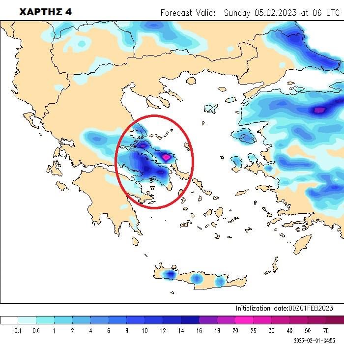 Στους χάρτες 4 με 6 επισημαίνουμε με τον κόκκινο κύκλο τις περιοχές όπου το προγνωστικό μας μοντέλο δίνει τις πιο πυκνές – επικίνδυνες χιονοπτώσεις με τα πρωινά στοιχεία που πήραμε πριν λίγο. Παρατηρείστε ότι σε αυτές τις περιοχές συμπεριλαμβάνεται και ο νομός Αττικής με τα χιόνια να κάνουν την εμφάνισή τους ακόμη και σε νησιά του Αιγαίου μας.