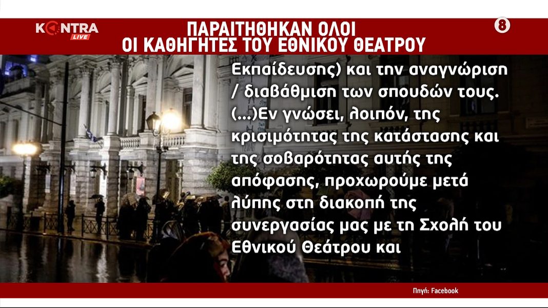 Το διδακτικό προσωπικό της πρώτης θεατρικής σκηνής της χώρας είχε προαναγγείλει προ ημερών πως θα παραιτηθεί σύσσωμο εάν μέχρι σήμερα δεν είχε δοθεί λύση στο θέμα που έχει προκύψει με το Προεδρικό Διάταγμα 85 εξαιτίας του οποίου οι σπουδαστές πραγματοποιούν πολυήμερη κατάληψη στη σχολή με το διδακτικό έτος να έχει πλέον χαθεί.