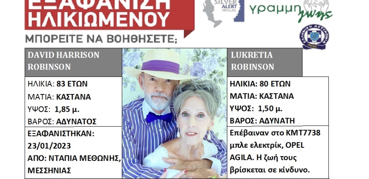 Υπενθυμίζεται ότι για το ζευγάρι που αγνοείται εκδόθηκε Silver Alert. Πρόκειται για τον David Harrison Robinson, 83 ετών και τη σύζυγό του, Lukretia Robinson, 80 ετών, οι οποίοι έφυγαν από το σπίτι τους στην περιοχή Ντάπια Μεθώνης, στις 23 Ιανουαρίου 2023, με προορισμό πιθανόν τη Μονεμβασία, ωστόσο έκτοτε τα ίχνη τους αγνοούνται.