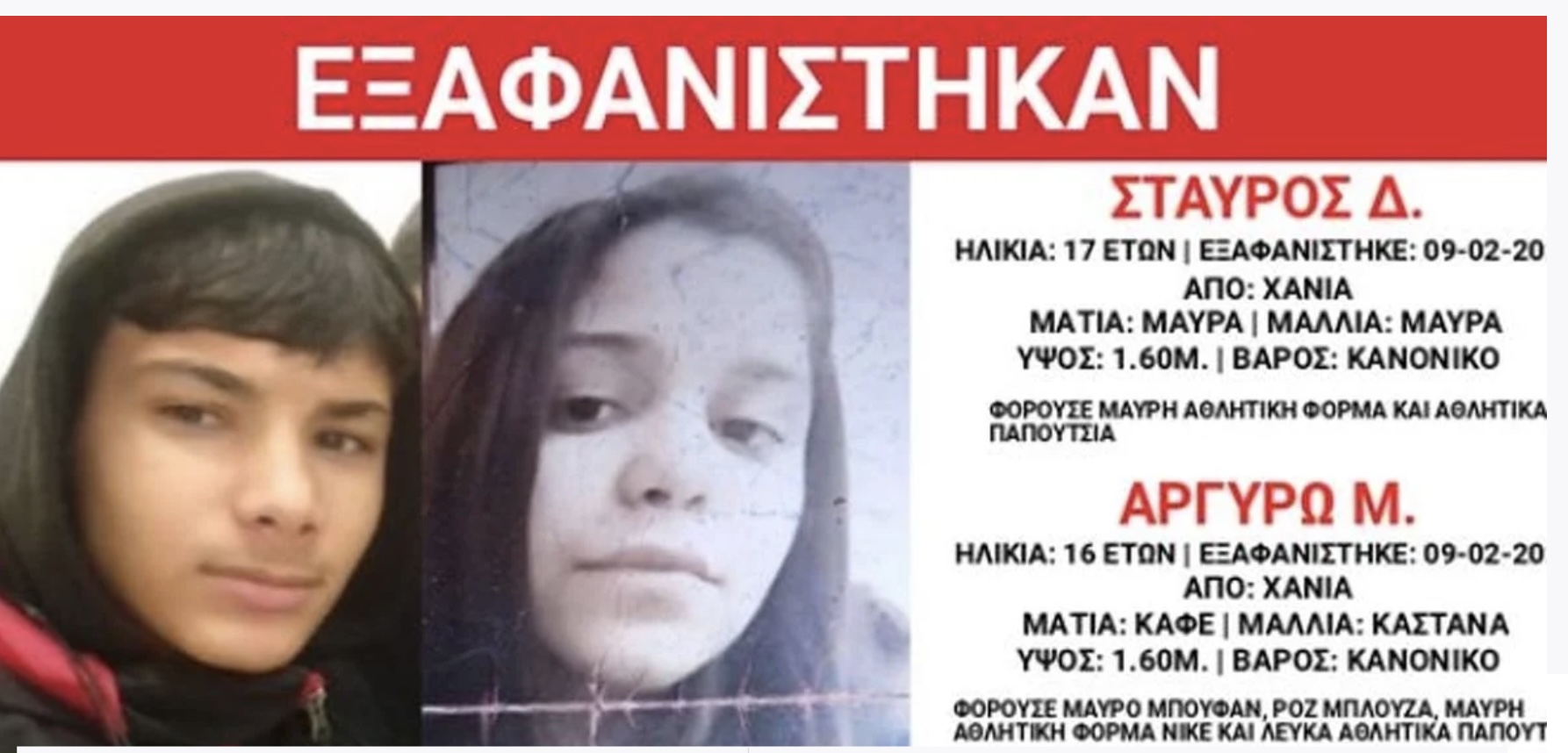 Το μεσημέρι της Τετάρτης δυο ανήλικα παιδιά εξαφανίστηκαν από την περιοχή των Χανίων. Πρόκειται για τον Σταύρο Δ. 17 ετών και την Αργυρώ Μ. 16 ετών.