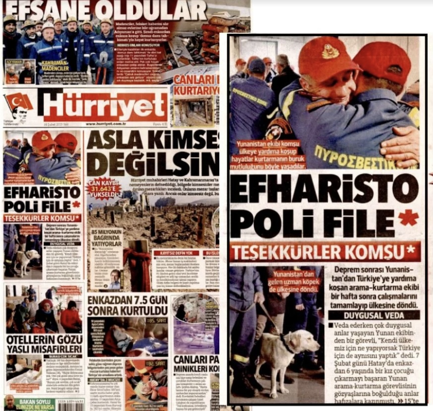 Την ίδια ώρα, η φιλοκυβερνητική εφημερίδα Hurriyet ευχαριστεί την Ελλάδα για τη συνδρομή της, εκδίδοντας πρωτοσέλιδο στο οποίο αναφέρει «EFHARISTO POLI FILE».