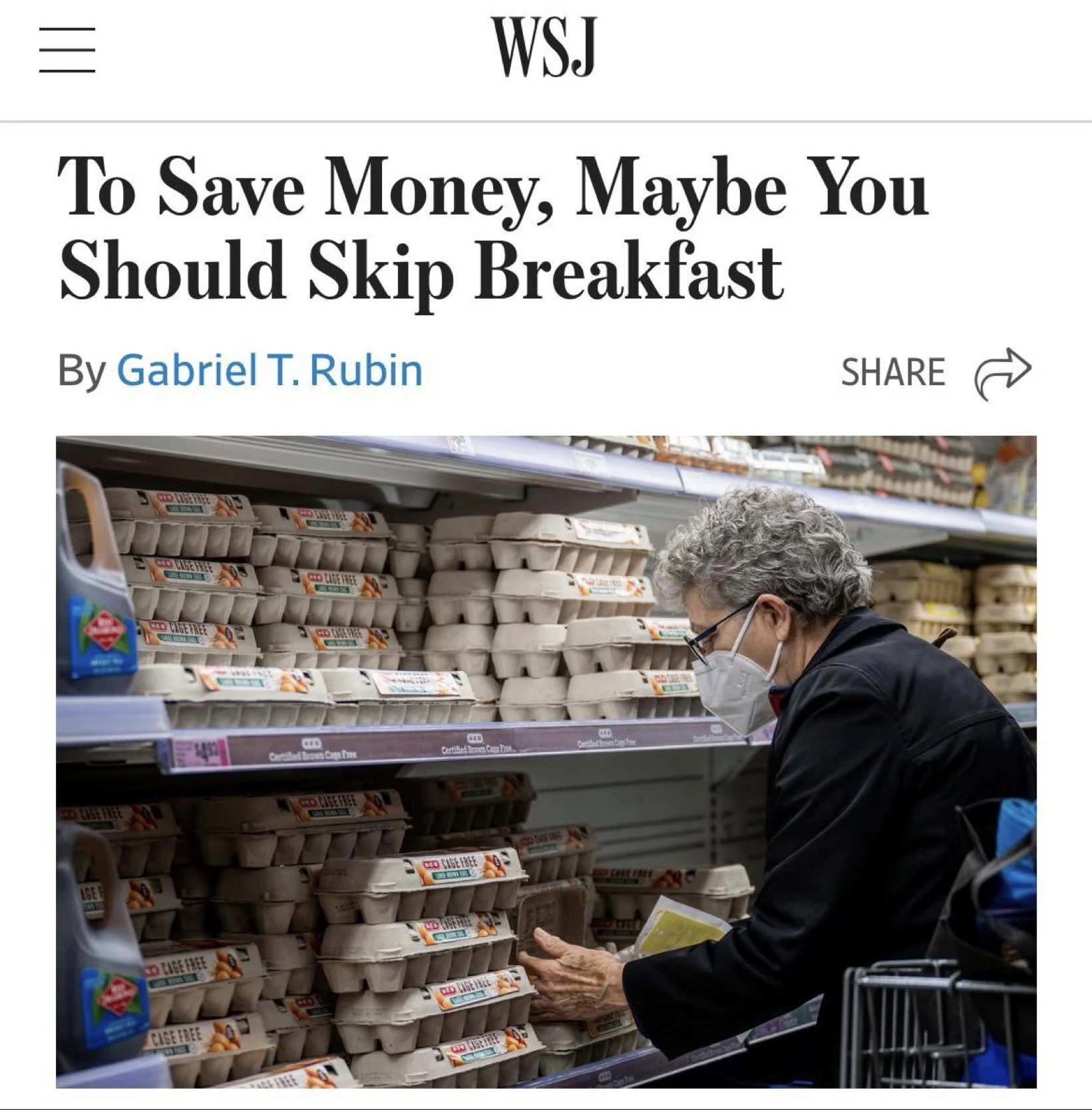 Θέλετε να κάνετε οικονομία; Κόψτε το φαΐ! Εάν νομίζετε ότι τέτοιες αρλούμπες ακούγονται μόνο από τύπους σαν τον Κυριάκο, τον Άδωνι και τον Λοβέρδο, κάνετε πλέον λάθος. Η συγκεκριμένη συμβουλή ανήκει στην Wall Street Journal η οποία προτρέπει τους πολίτες να μην τρώνε πρωινό για να κάνουν οικονομία!