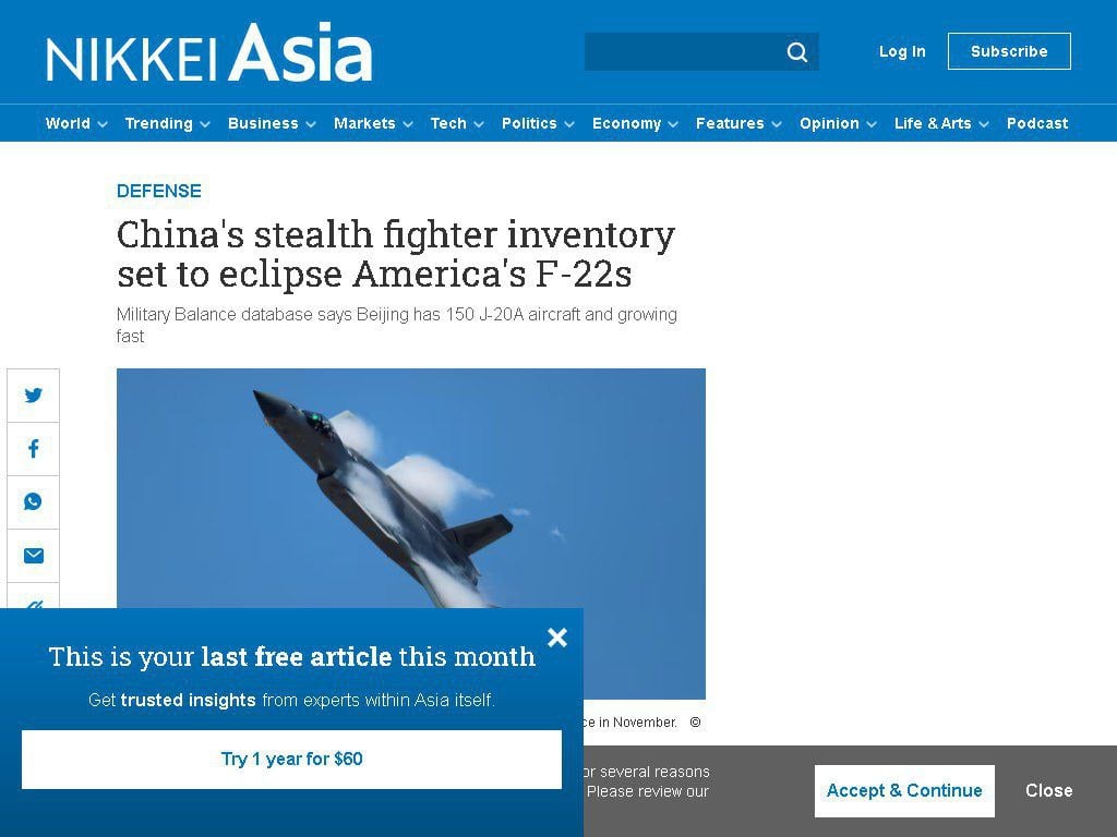 Ο Chipman είπε ότι η βάση δεδομένων Military Balance δείχνει τώρα πάνω από 150 μαχητικά J-20A. Αν και οι Η.Π.Α. αυξάνει επίσης τον αριθμό των F-35A πέμπτης γενιάς της, και αυτά τώρα ανέρχονται σε περίπου 360, «Ο ρυθμός της αμυντικής βιομηχανικής παραγωγής της Κίνας σημαίνει ότι πλησιάζει», είπε.