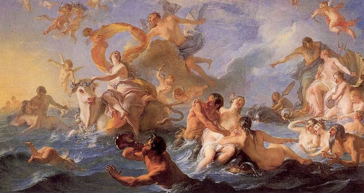 Ήταν πάρα πολύ όμορφος, γιατί ήταν κατάλευκος, με ωραία στριφογυριστά κέρατα και ήμερο βλέμμα. Πηδούσε λοιπόν κι αυτός στην ακρογιαλιά και μούγκριζε τόσο γλυκά, που η Ευρώπη τόλμησε ν’ ανέβει πάνω του. Μόλις έγινε αυτό, ο Δίας όρμησε προς τη θάλασσα με κείνη στην πλάτη του, έπεσε μέσα και κολυμπούσε. Αυτή τότε τρομοκρατήθηκε πολύ, με το αριστερό χέρι κρατιόταν από το κέρατο, για να μη πέσει και με το άλλο κρατούσε το πέπλο της που ανέμιζε.