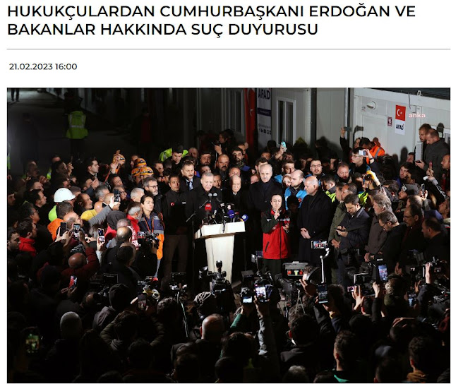 Ομάδα δικηγόρων κατέθεσε μήνυση κατά υπουργών, νομαρχών, δημάρχων και εργολάβων, συμπεριλαμβανομένου του Προέδρου Ρετζέπ Ταγίπ Ερντογάν και του Διευθυντή Επικοινωνιών Φαχρετίν Αλτούν, για υπευθυνότητα στην απώλεια ζωών στους σεισμούς που έπληξαν το Καχραμανμαράς και 10 επαρχίες.