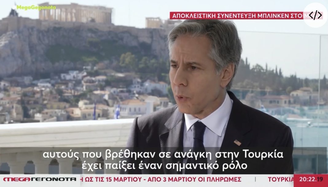 Αναφερόμενος στην επίσκεψή του στην Τουρκία, ο Άντονι Μπλίνκεν είπε ότι ένα από τα πράγματα που του είπαν στη γειτονική χώρα είναι πόσο σημαντικό ήταν που έσπευσαν τόσοι Έλληνες και τόση βοήθεια από την Ελλάδα στην ώρα της ανάγκης. «Νομίζω ότι αυτό δημιουργεί μια καλύτερη ατμόσφαιρα, αλλά κοιτάξτε: Είναι περίοδος εκλογών στην Ελλάδα και την Τουρκία και αυτό πάντα περιπλέκει τα πράγματα» σημείωσε.