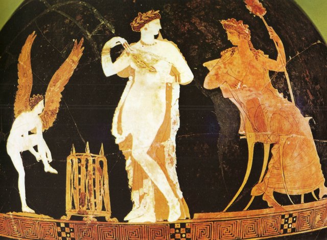 Σε αττικό σκύφο του 5ου αι. π.Χ. σάτυρος κουνά μια κοπέλα σύμφωνα με το έθιμο της αιώρας, το οποίο συνδέεται με τα Ανθεστήρια.
