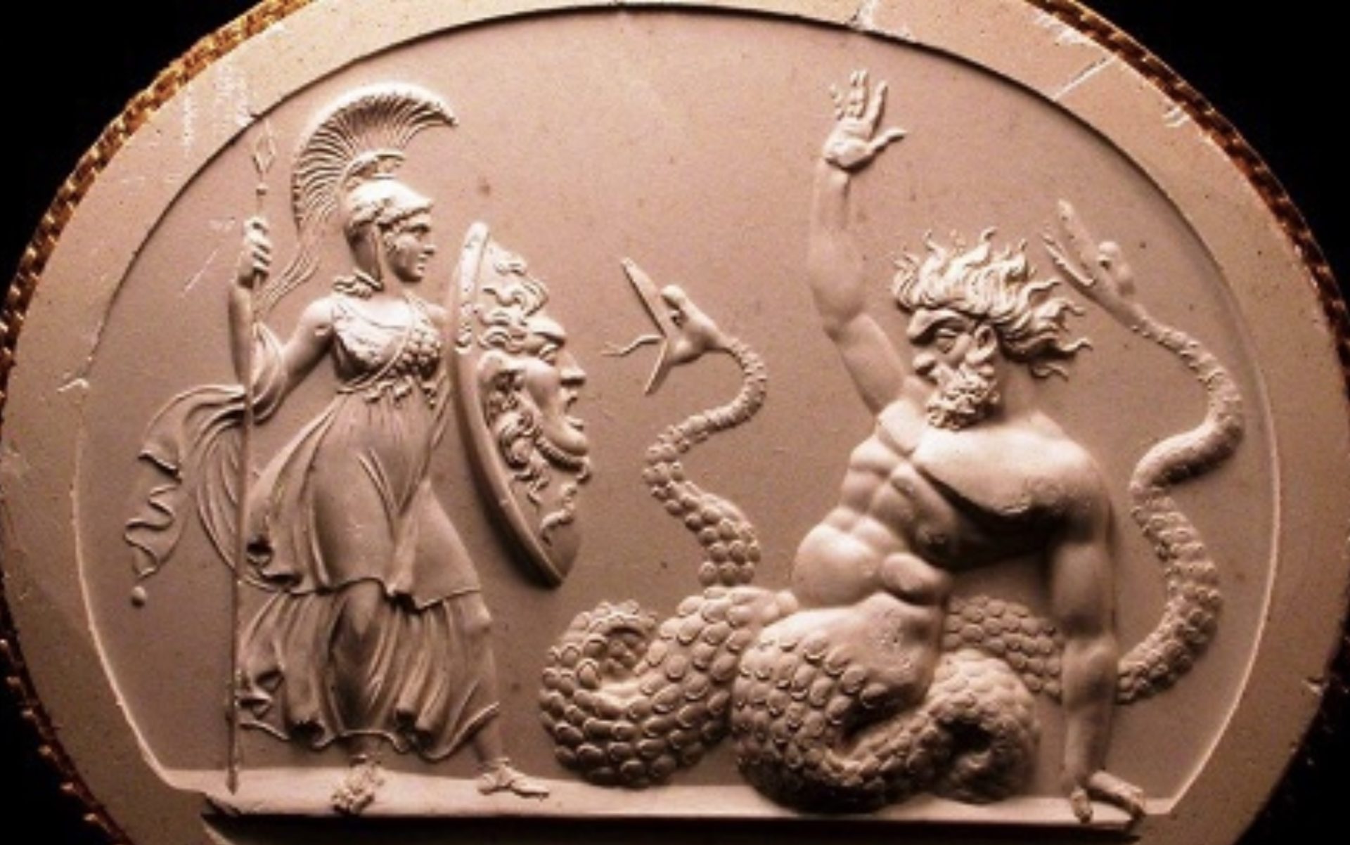 Φωτογραφία: η Αθηνά εξοντώνει τον Γίγαντα Πάλλα προβάλλοντας του την Αιγίδα. Πρόκειται για ετεροχρονισμό, αφού η Αιγίδα ήταν υπερόπλο φορητό, το οποίο η Αθηνά είχε πάντα ριγμένο στους ώμους της, ενώ προβάλλει στον Πάλλα την ασπίδα με το κεφάλι της μέδουσας Γοργώς, υπερόπλο που υποδηλεί το Γοργόνειο..