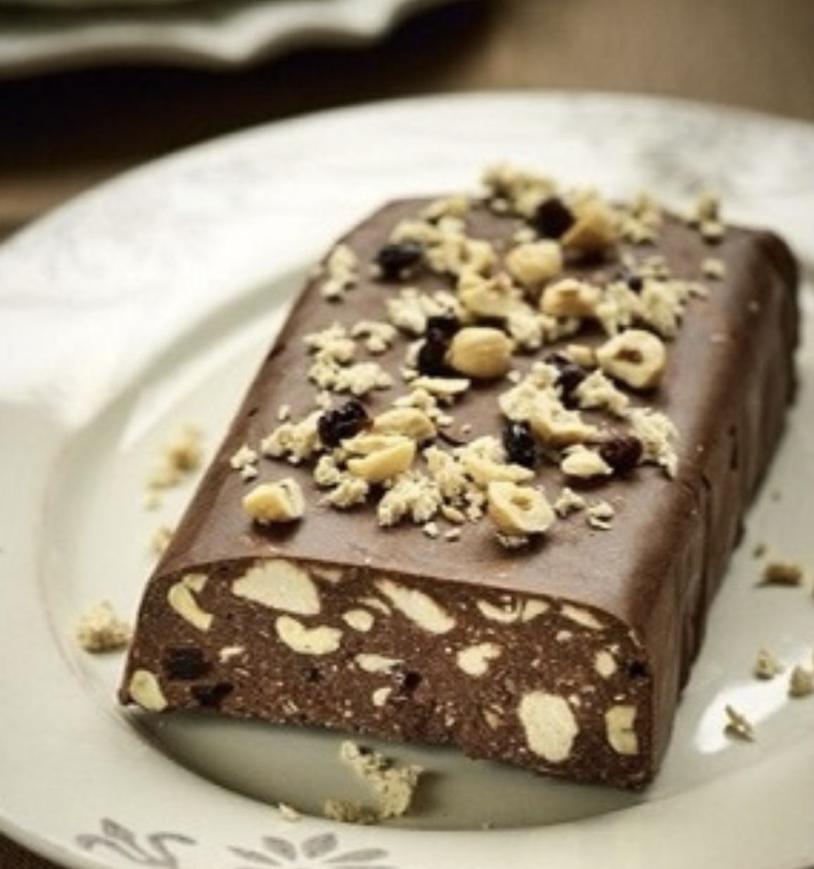 Το ξεφορμάρετε σε μακρόστενη πιατέλα και διακοσμείτε με ένα μίγμα από φουντούκια, σταφίδα και τριμμένο χαλβά που κρατήσατε στην άκρη.