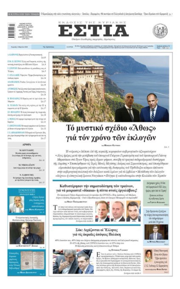 Το 40% των Ελλήνων συμφωνεί με τις απόψεις του, ένα άλλο 40% διαφωνεί, το 20% δεν εκφέρει γνώμη! Και αλλα πολλα αποκαλυπτικά θέματα στην Εστια που κυκλοφορεί αύριο Κυριακή.