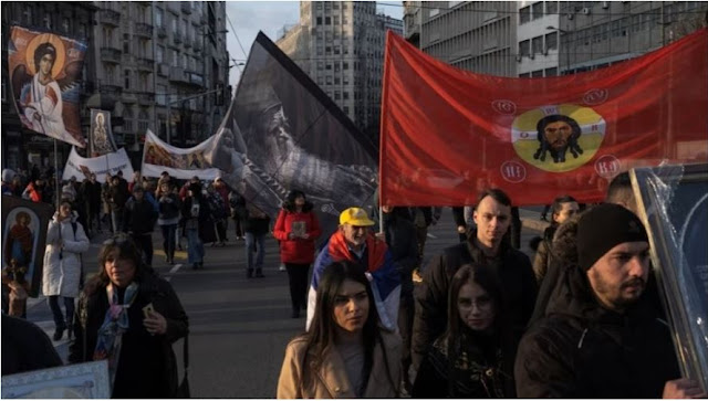 Εκατοντάδες Σέρβοι εθνικιστές και Ορθόδοξοι Χριστιανοί πραγματοποίησαν πορεία στο Βελιγράδι την Κυριακή για να διαμαρτυρηθούν για το σχέδιο της Δύσης για βελτίωση των σχέσεων μεταξύ Σερβίας και Κοσσυφοπεδίου.