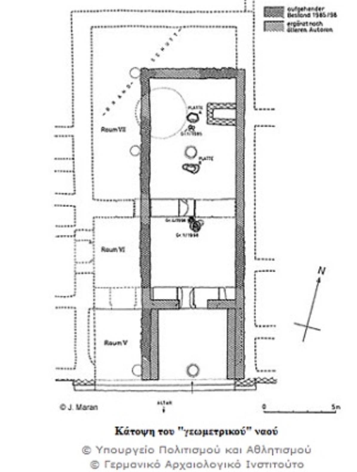 Έτσι θεωρήθηκε ότι το κτήριο αυτό είναι ένας ναός των γεωμετρικών χρόνων, που ιδρύθηκε στο χώρο του μυκηναϊκού Μεγάρου και στον οποίον πρέπει να λατρευόταν η θεά Ήρα. Δυστυχώς η πλήρης αποκάλυψη του κτηρίου αυτού ήδη από την εποχή του Schliemann έχει στερήσει την έρευνα από πολύτιμες ανασκαφικές ενδείξεις που θα μπορούσαν να δώσουν μία οριστική απάντηση στο ακόμη και σήμερα αναπάντητο ερώτημα σχετικά με τη χρήση και τη χρονολόγηση του κτηρίου.