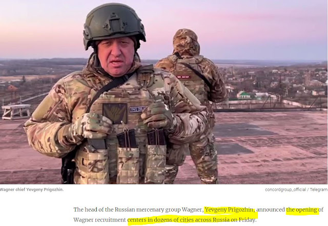 Ο επικεφαλής της ρωσικής ομάδας μισθοφόρων Βάγκνερ, Γιεβγκένι Πριγκόζιν, ανακοίνωσε το άνοιγμα των κέντρων στρατολόγησης της Βάγκνερ σε δεκάδες πόλεις σε ολόκληρη τη Ρωσία την Παρασκευή.