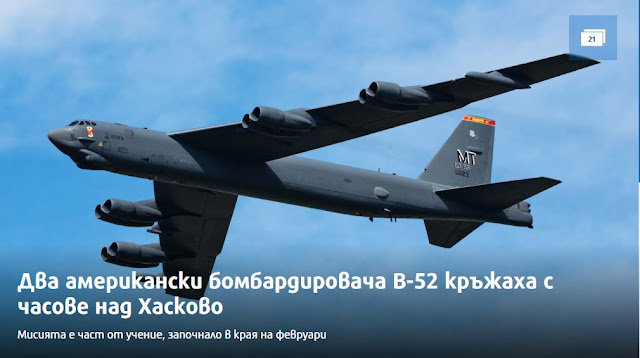 Στα κοινωνικά δίκτυα της Βουλγαρίας γίνεται αναφορά για δύο αμερικανικά στρατηγικά βομβαρδιστικά Boeing B-52H Stratofortress που πραγματοποίησαν κύκλους πάνω από το Χάσκοβο και το Κάρτζαλι.