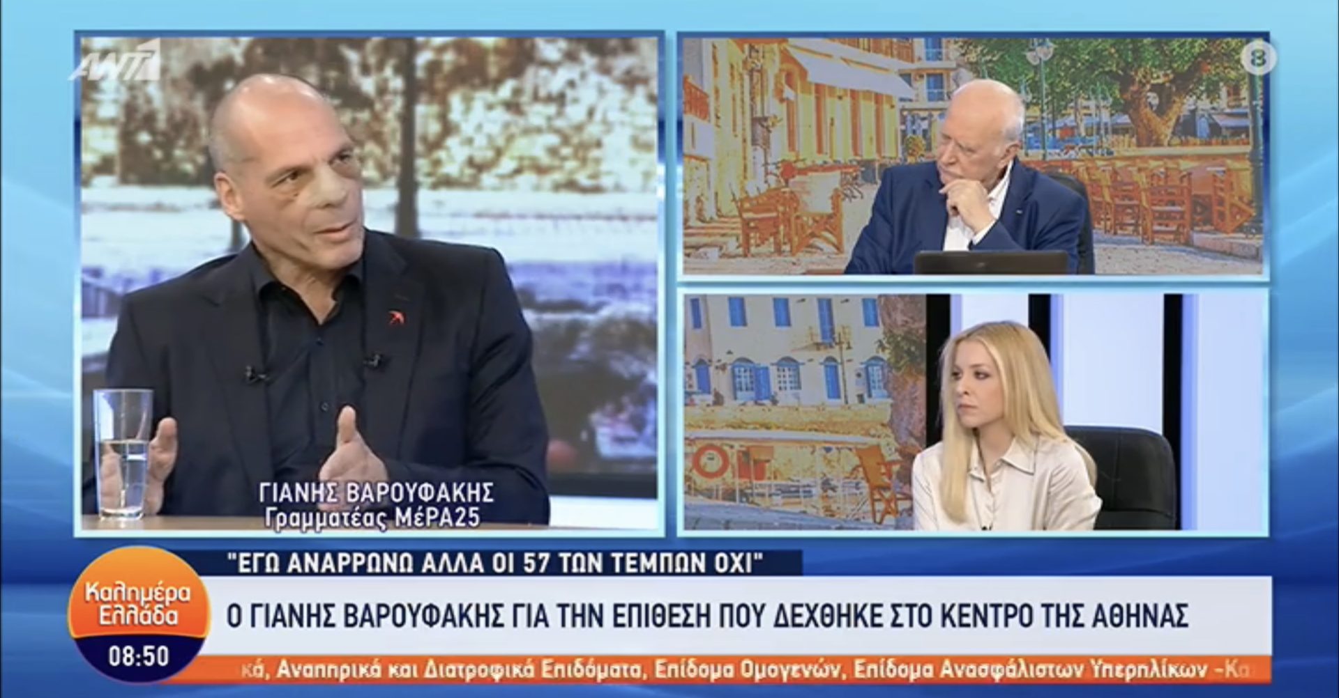 Διπλό σοκ για τους τηλεθεατές μετά την εμφάνιση του Γιάννη Βαρουφάκη στην εκπομπή του Γιώργου Παπαδάκη και της Ειρήνης Αναστασοπούλου στον ΑΝΤ1, αμέσως μετά τον ξυλοδαρμό του.