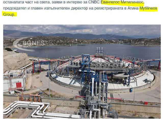 «Η Ελλάδα γίνεται πύλη LNG προς τον υπόλοιπο κόσμο, δήλωσε στο CNBC ο Ευάγγελος Μυτιληναίος, πρόεδρος και διευθύνων σύμβουλος του εισηγμένου στην Αθήνα Ομίλου Μυτιληναίος», γράφει σήμερα βουλγαρικό δημοσίευμα.