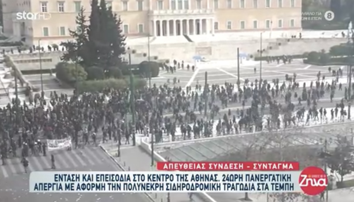 Με επεισόδια τα οποία προκάλεσαν κουκουλοφόροι αμαυρώθηκε η ειρηνική πορεία που κάνουν στο κέντρο της Αθήνας εργαζόμενοι, φορείς, συλλογικότητες, σωματεία και άλλοι πολίτες στο πλαίσιο της 24ωρης απεργίας της ΓΣΕΕ και της ΑΔΕΔΥ για το δυστύχημα στα Τέμπη.