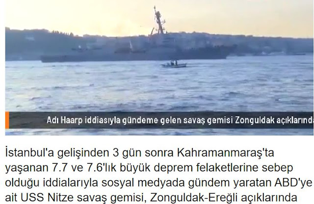 Τρεις ημέρες μετά την άφιξή του στην  Κωνσταντινούπολη, το αμερικανικό πολεμικό πλοίο USS Nitze, το οποίο δημιούργησε σάλο στα μέσα κοινωνικής δικτύωσης με τους ισχυρισμούς ότι προκάλεσε τους καταστροφικούς σεισμούς 7,7 και 7,6 Ρίχτερ στο Καχραμανμαράς, αγκυροβόλησε στην ανοικτή θάλασσα  του Zonguldak-Ereğli, γράφει τούρκικο δημοσίευμα.