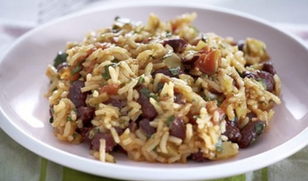 Σοτάρουμε στο λάδι το κρεμμύδι με τις πιπεριές και προσθέτουμε τα υπόλοιπα λαχανικά, τα φασόλια, το ρύζι και το νερό των φασολιών. Αφήνουμε το φαγητό να βράσει για 20 λεπτά.