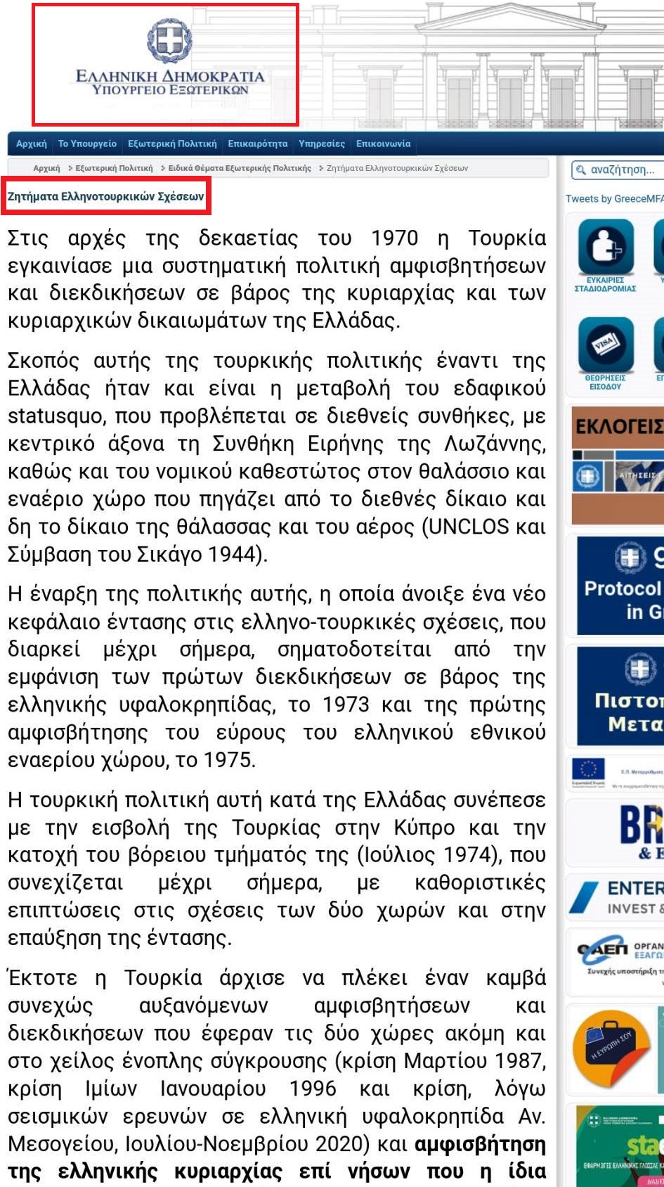 «Ζητήματα Ελληνοτουρκικών σχέσεων» … Στην ιστοσελίδα μεταξύ άλλων αναφέρεται…υπεξ1
