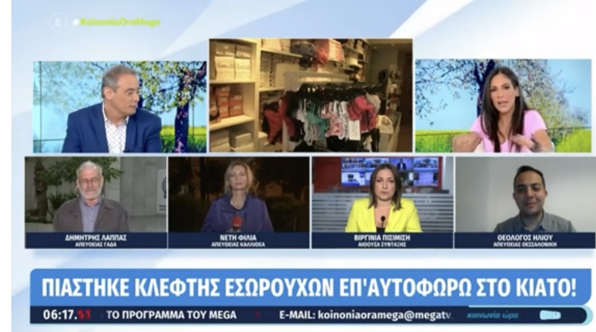 Η παρουσιάστρια της εκπομπής «Κοινωνία Ώρα Mega», αποκάλυψε πως έχει πέσει κι εκείνη θύμα κλοπής από γείτονα της ο οποίος της άρπαζε τα εσώρουχα. Για να διαλευκανθεί η υπόθεση η δημοσιογράφος αναγκάστηκε να καλέσει την αστυνομία…
