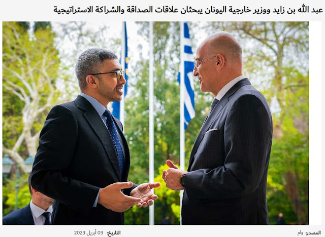 Η Αυτού Υψηλότης Σεΐχης Αμπντουλάχ μπιν Ζαγιέντ αλ Ναχιάν, Υπουργός Εξωτερικών και Διεθνούς Συνεργασίας, και ο Νίκος Δένδιας, Υπουργός Εξωτερικών της Ελλάδας, συζήτησαν τη φιλία και τη στρατηγική εταιρική σχέση μεταξύ των δύο χωρών, γράφει η αραβική Albayan.