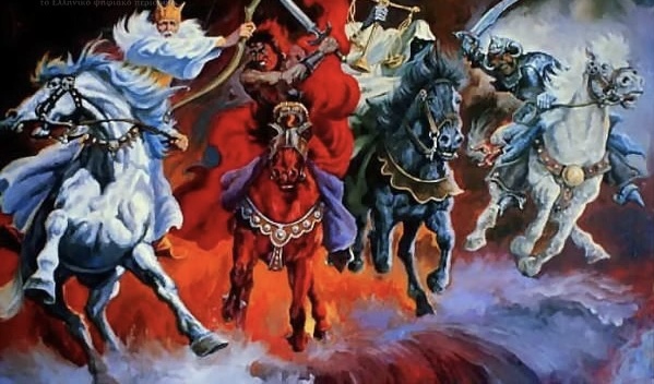 Οι πρώτες τέσσερις από τις επτά σφραγίδες είναι γνωστές ως οι τέσσερις καβαλάρηδες της Αποκάλυψης. Η πρώτη σφραγίδα εισάγει τον Αντίχριστο (Αποκάλυψη 6:1-2). Η δεύτερη σφραγίδα προκαλεί μεγάλο πόλεμο (Αποκάλυψη 6:3-4). Η τρίτη από τις επτά σφραγίδες προκαλεί λιμό (Αποκάλυψη 6:5-6). Η τέταρτη σφραγίδα εισάγει μάστιγες, επιπλέον λιμό και επιπλέον πόλεμο (Αποκάλυψη 6:7-8).
