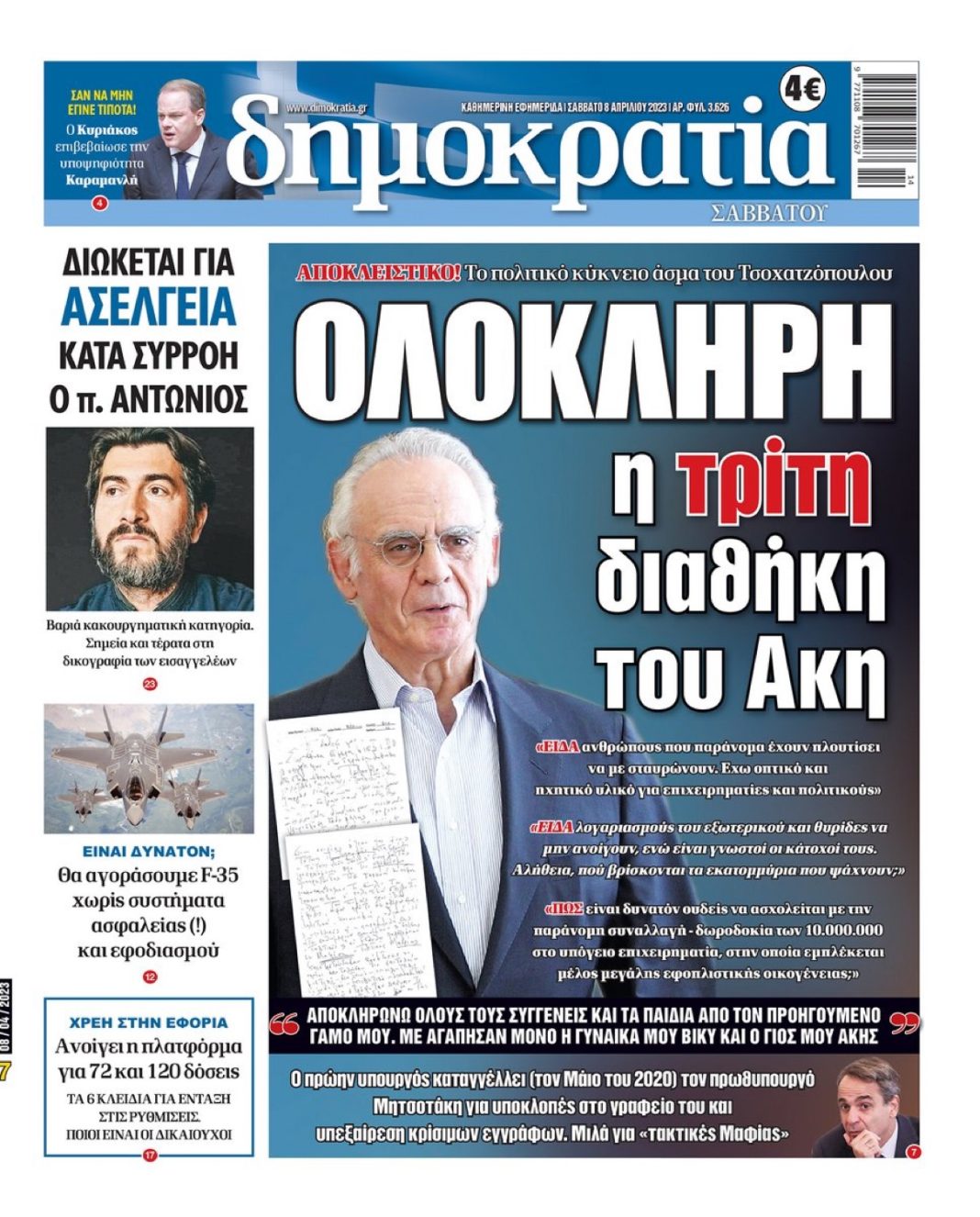 Αύριο στη @DimokratiaGr μια μεγάλη αποκλειστικότητα. Η τρίτη διαθήκη του #Ακη ολόκληρη, για πρώτη φορά στο φως. Τι λέει για τις θυρίδες, τα λεφτά που δεν βρέθηκαν, το ΠΑΣΟΚ, τους εμπόρους όπλων κλπ. Επίσης καταγγέλλει (το 2020!) υποκλοπές του Μητσοτάκη και τον αποκαλεί “μαφία”