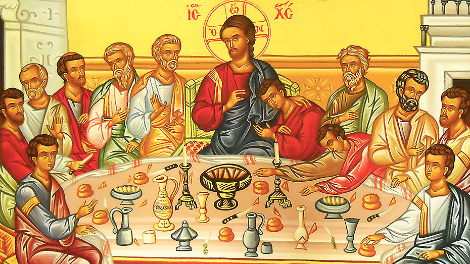 Κατόπιν πήρε ψωμί στα χέρια Του και είπε: «Λάβετε φάγετε». Το ίδιο έκανε και με το ποτήρι του κρασιού λέγοντας: «Πιέστε απ’ αυτό όλοι, γιατί αυτό είναι το αίμα Μου, της νέας Συμφωνίας. Αυτό να κάνετε για να Με θυμάστε». Μετά από αυτή τη στιγμή ο Ιούδας, μόλις έφαγε τον άρτο έφυγε και συμφώνησε με τους αρχιερείς να τους Τον παραδώσει.