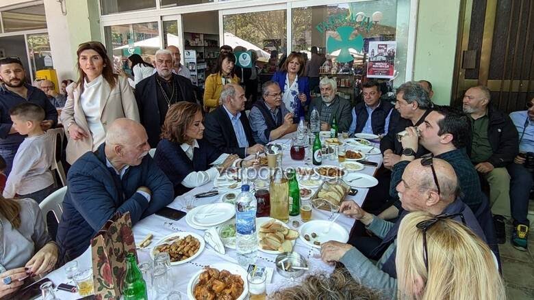 Στο τραπέζι διοακρίνονται επίσης, ο βουλευτής Χανίων Βασίλης Διγαλάκης, ο δήμαρχος Πλατανιά Γιάννης Μαλανδράκης, οι υποψήφιοι βουλευτές Γιώργος Πετράκης του ΣΥΡΙΖΑ και Χαρίκλεια Ντερμανάκη της ΝΔ, η σύζυγος του Παύλου Πολάκη, Δώρα Τσούκα, κ.α.