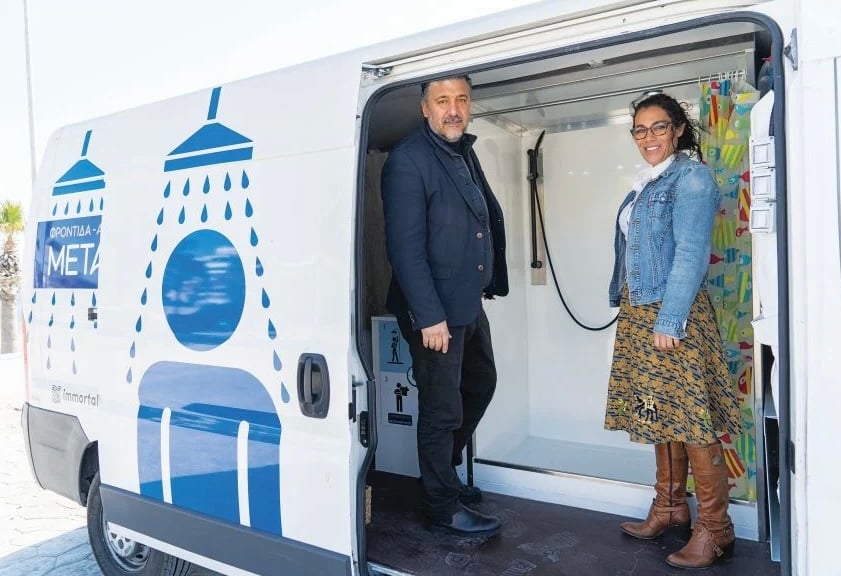 «Το βαν αγοράστηκε το 2022 από το Βέλγιο, με προσωπικές οικονομίες. Εψαξα αρκετά, αφού αναζητούσα ένα όχημα που θα είχε τις σωστές διαστάσεις, ώστε να φιλοξενήσει μια ευρύχωρη διπλή ντουσιέρα, μια μεγάλη γκαρνταρόμπα και ταυτόχρονα να υποστηρίξει δεξαμενή ζεστού νερού, που είναι απαραίτητη για το μπάνιο των αστέγων. Εκτός από την προσαρμογή του καυστήρα, ώστε να παρέχουμε ζεστό νερό, εξαιρετικά σημαντική είναι η παροχή νερού, το οποίο, μαζί με οτιδήποτε άλλο χρειαζόμαστε, παρέχεται από τον Δήμο Παλαιού Φαλήρου» μας εξηγεί η Βίκυ.